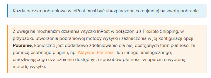Pobranie - możesz włączyć opcję pobrania dla wybranej metody wysyłki (Paczkomat, Kurier). Kwota pobrania zostanie naliczona automatycznie na podstawie wartości zamówienia. Konto dla pobrania zostanie pobrane z konta InPost. W formularzu zamówienia lista dostępnych Paczkomatów będzie ograniczona do posiadających opcje płatności.