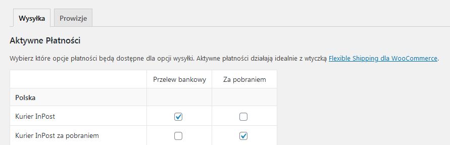 - Jeżeli wszystko przebiegło poprawnie, pojawią się w tym miejscu utworzone przed chwilą metody wysyłki. Zaznacz za pomocą checkboxów jakie formy płatności mają być dostępne dla której metody wysyłki, wybierając Przelew bankowy dla metody Kurier InPost i Pobranie dla Kurier InPost za pobraniem lub stosując własne ustawienia.